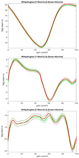 Hip angles’ comparison between before and after CLS in right side. Note: Green: before CLS, Red: after CLS; X, Y, and Z: the sagittal, coronal, and transverse planes. Thickness lines: mean, fined lines: standard error of mean. The curve patterns were plotted using right side 118 pair trials for before and after CLS, and some trails with gaps were removed. As the trails used to plot figures were resampled to 50 frames, there are slightly numeric differences between figures and tables. Nevertheless, the figures show the trends between before and after CLS.