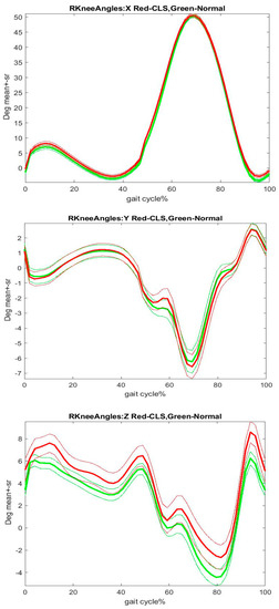 Knee angles’ comparison between before and after CLS in right side. Note: Green: before CLS, Red: after CLS; X, Y, and Z: the sagittal, coronal, and transverse planes. Thickness lines: mean, fine lines: standard error of mean. The curve patterns were plotted using right side 118 pair trials for before and after CLS, and some trails with gaps were removed. As the trails used to plot figures were resampled to 50 frames, there are slightly numeric differences between figures and tables. Nevertheless, the figures show the trends between before and after CLS.