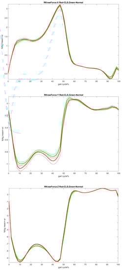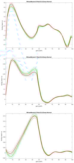 Therefore, depending on the kinetic literature, increasing the values of the knee moment in the Flexion/Extension and Varus/Valgus directions, raising the power values of all lower limb joints and decreasing the hip internal/external rotational moment during the gait after CLS can be considered as healthy signs of the CLS posture on the lower limbs [23,26,28]. However, only the increasing knee force can be considered an unhealthy sign of CLS on the knee joint [24].