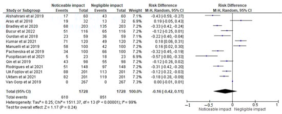 The forest plot represented in Figure 5 shows the results of the meta-analysis that examined the impact of complications on the sample size, which consisted of patients undergoing orthodontic treatment in any form, as reported in the clinical studies [,,,,,,,,,,,,,]. The risk difference found was −0.16 [−0.42, 0.11], which suggests that the risk of complications might be lower in the group receiving the intervention (which differed from study-to-study as per the complication that was observed in it) compared to the control group. However, it is important to note that the confidence interval ranged from −0.42 to 0.11, which indicates that the true effect size may be anywhere within this range. The forest plot also reported heterogeneity statistics, which indicate how much variation existed between the studies included in the meta-analysis. The Tau2 value of 0.25 suggests that there is substantial heterogeneity, meaning that the studies differ significantly from each other in terms of their effect sizes. The Chi2 value of 1511.37, with 13 degrees of freedom and a p-value of <0.00001, indicates significant heterogeneity. The I2 value of 99% suggests that almost all of the heterogeneity is due to true differences in effect sizes, rather than chance or sampling error. This high level of heterogeneity means that the studies may have different populations, interventions, or outcomes, which makes it difficult to draw firm conclusions from the meta-analysis. In summary, the forest plot suggests that the intervention may reduce the risk of complications, but the true effect size is uncertain due to the wide confidence interval and high level of heterogeneity. Future research should aim to address the sources of heterogeneity and provide more precise estimates of the intervention’s effects.