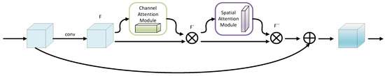 Unlike others, we inserted the module into the backbone network. This method can improve detection accuracy without slowing down the detection speed. The specific structure of the residual CBAM is shown in Figure 6.