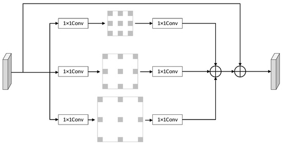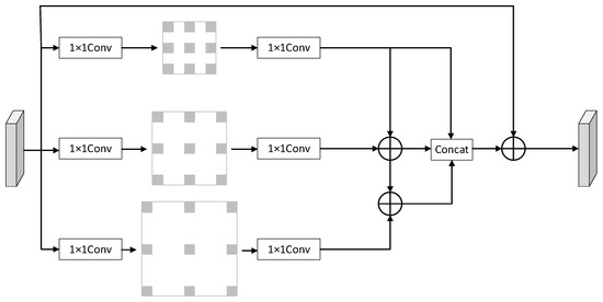 As shown in Figure 7, we introduced the MDCM to aggregate context information. We first used the 1 × 1 convolution to reduce the amount of computation. Then we used 3 × 3 convolution with different dilation rates to obtain context information from the feature map.