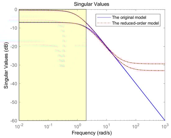 To illustrate the accuracy of (26) approximating (24), we provide Figure 2 and Figure 3 that demonstrate the singular value curves of with and , respectively. It can be observed that, in the given frequency range ( rad/s shaded region), the singular value curves of the reduced-order system closely match those of the original system , while the actual maximum singular values of the error system are strictly upper-bounded by . Based on the above analysis, one can conclude that the proposed reduced-order model is effective in approximating a high-order system with significant small errors.