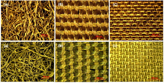 Micrograph images of copper-plated textiles NL-VL-S-016 (A), NL-WE-S-056 (B) and NL-WE-S-045 (C) and the corresponding textiles with plating in (a–c).