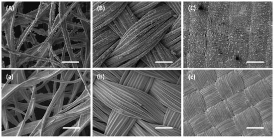 SEM images of copper-plated textiles consisting of 55% of viscose and 45% polyester (A), 100% polyestersulfone (B), a taffeta lined and calendered polyamide textile (C) and the corresponding fabrics (A-a, B-b and C-c) with Ni plating in (a–c). Scale bar for all the images: 100 m.