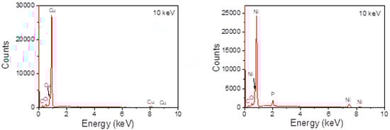 The energy-dispersive x-ray spectroscopy (EDX) of the copper layer shows that copper is the main element in this layer (Figure 4). The C and O peaks could be due to surface contamination or the fibers. In the nickel-coated layer, except for the main element of nickel, a small part of phosphorus is detected. The C and O peaks may be also due to surface contamination or the fibers. The phosphorus comes from the plating bath containing sodium hypophosphite monohydrate ().
