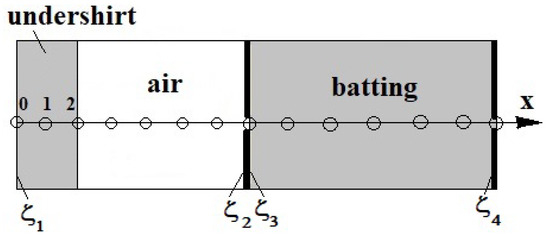 The geometry of the garment is presented in Figure 5. It includes an undershirt, air layer, and thick porous fibrous batting. Thin lining reflecting the heat transported from the human body can be embedded at the boundary between the air layer and batting. The main assumption of the theoretical model is the hypothesis that the heat and moisture transport dominate in the direction which is normal to the body and garment surface, since the thickness of the garment is much less than curvature radius of the surface. The transport in the direction tangential to the body surface is neglected. This results in the one-dimensional problem formulation along the normal coordinate are designated as x.