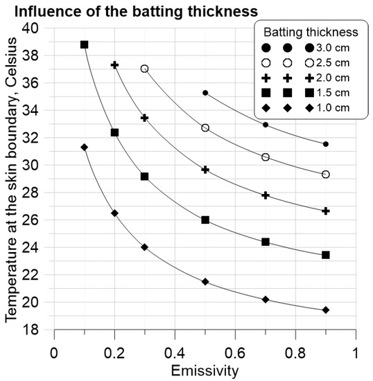 where is the emissivity of the human body (see Figure 5), is the emissivity of the left side of the lining, is the emissivity of the right side of the lining, is the emissivity of the left side of the batting lining, and is the empiric constant chosen from the condition that the skin temperature equals to 31 C for the polyester batting of 3 cm thickness at the ambient temperature of C. In the simulations presented in Section 6.1 the emissivity is varied, whereas other parameters are assumed to be constant . According to this decomposition, the Neumann boundary condition at the human body for is reformulated as