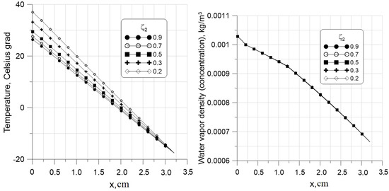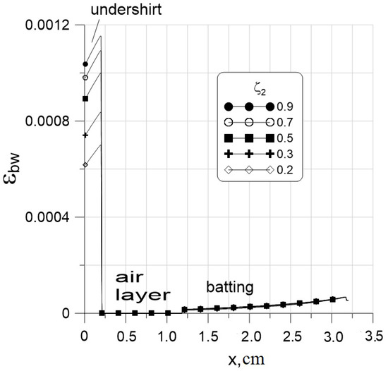 The infrared reflective lining (IR) was embedded at the boundary between the air layer and the polyester batting. It has a strong effect by reflecting back the heat transmitted from the human body (see Figure 8). The skin temperature C can be achieved for the garment thickness of cm for , cm for , and cm for . All these are quite achievable, as shown in the Section 3. The temperature in the domain between the body and the IR increases when the emissivity of the lining decreases (Figure 9, left), whereas the effect of the IR on the vapor concentration is negligible (Figure 9, right). The bound water content , depending on , is shown in Figure 10. Within the batting the bound water content is negligible and does not depend on the . On the contrary, the bound water content is substantial in the undershirt space. The smaller is and the higher the temperature T in the undershirt space, the lower the bound water content is in it.