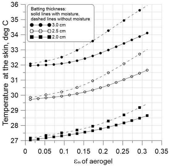 As follows from Figure 12, the temperature of the skin surface of 31 degrees can be achieved with a relatively low content of the aerogel , at which most of the insulating layer is air. The effective density of the material is only 25 . To achieve C, it is possible to reduce the thickness of the thermal insulation layer to cm, if the volume fraction of fiber increases to 25 percent. This way cannot be considered a successful solution because the effective density of the material reaches 550 , which makes the clothes significantly heavy. Humidity significantly reduces the insulating properties of protective clothing, especially with an increase in the thickness and content of fiber in the insulating layer . With a thickness of 3 cm and , the temperature difference between cases accounting and neglecting humidity is degrees.