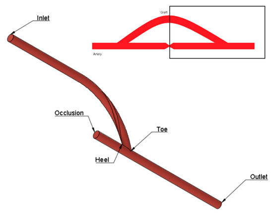 Geometries were generated using the computer-aided drawing (CAD) software Autodesk Fusion 360 v.2.0.13881. All geometries consist of an end-to-side anastomosis between the bypass graft and an idealized model of the femoral artery. The ratio of the graft diameter to the arterial diameter was set to one. A conceptual model of geometries used is shown in Figure 1.