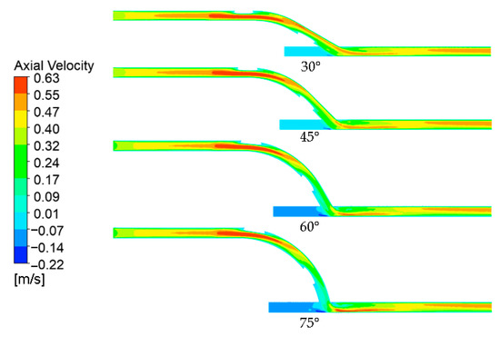 The axial velocity profiles across the longitudinal section of the model across different anastomosis angles are shown in Figure 6. Linking the discussion to the pressure distributions observed, the velocity profile supported the idea of greater inflow resistance in larger anastomosis angles. At lower anastomosis angles, the flow achieved a faster velocity (orange) much earlier in the entry graft length compared to larger anastomosis angles, indicating less resistance to flow. The jump from orange to red values signified the graft inlet where the area was reduced due to the presence of the ridge, so the velocity increased based on the continuity equation.