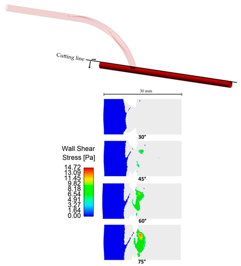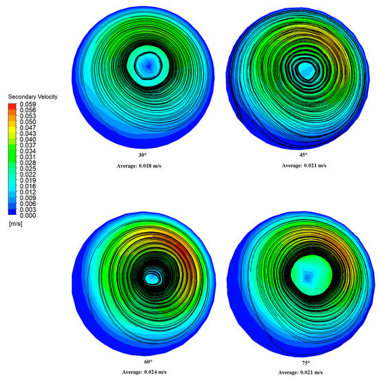 Meanwhile, the black lines in Figure 7 represent the surface streamline. This represents the paths through which zero particle masses would pass, and it is calculated using the Runge–Kutta method of vector variable integration [38]. Consistent with the secondary velocity profile, the cores of the surface streamlines were shifted toward the upper artery region. Single dominant spiral flows were observed in the 45°, 60°, and 75° grafts. Meanwhile, two concentric spiral flows, associated with significantly lower secondary velocity magnitudes, were observed for the 30° graft. Because not all of the spiral flow character was directed in the artery walls (due to some spiral character being lost in the inner spiral flow), a weaker swirling motion was experienced by the artery walls, reducing the shear forces and friction generated on the walls. This could explain the lower WSS pressure drop observed for the 30° graft relative to higher anastomosis angles [39].