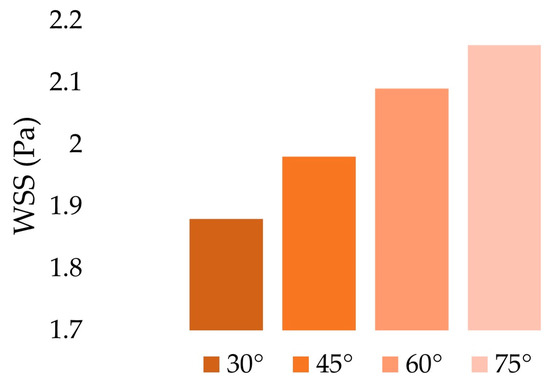 Figure 8 shows the spatial average of WSS according to the anastomosis angle. The values reported were computed over the whole wall of the host artery. The results indicated a positive linear relationship between the anastomosis angle and the spatial average values of WSS (r2 = 0.9923). This relationship may be explained by both the bulk motion and the secondary flow components of the fluid. As observed in the axial velocity contour maps (Figure 6), higher axial velocities near the walls and higher velocity gradients were observed for larger anastomosis angles which translate to increased shear stress [42]. Furthermore, the swirl motion represented by the secondary velocity also generated higher shear stress in the artery walls due to the tangential velocity vector [39]. This seemed to suggest that increasing the anastomosis angle between the graft and artery may have the beneficial effect of reducing the tendency of the graft to induce intimal thickening by increasing the WSS. However, this presented a problem wherein an increased anastomosis angle resulted in the development of pathologically high WSS.