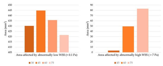 Extent of the area affected by abnormal WSS. The 30-degree anastomosis angle resulted in the total elimination of abnormally high WSS, so it is not present in the chart on the right.