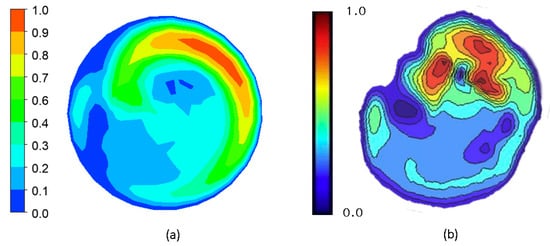 Qualitative validation of the simulation results by comparison of secondary velocity contours on the cross-section of the artery 5 mm from the distal anastomosis toe of a 60° ridged graft. (a) CFD result; (b) Doppler imaging result from Kokkalis et al. [50].