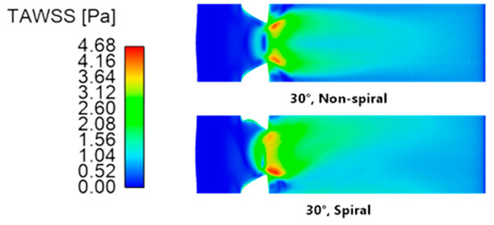 Figure 14 shows the TAWSS contours of the host artery that has been grafted at a 30° anastomosis angle using non-spiral and spiral configurations. A qualitative analysis of the two models shows two prominent differences between the non-spiral and spiral flow. First, it can be seen that a conventional, non-spiral graft resulted in a symmetric TAWSS profile that extended distally from the anastomosis toe, whereas a ridged, spiral-flow-inducing graft resulted in an asymmetric one. This agreed with the findings of Ruiz-Soler et al. [24,25], showing that a ridged graft design resulted in an asymmetric TAWSS contour due to the bulk swirling motion in the host artery. Another noticeable difference lies in the region where the blood flow from the graft directly impinged the artery bed. In the non-spiral configuration of the graft, the said region was characterized by low TAWSS. Meanwhile, in the spiral graft configuration, elevated TAWSS was observed on the region, extending proximally from the anastomosis toe toward the occlusion. Closer inspection also shows higher TAWSS along the suture line of the anastomosis. This may also be explained by the fluid dynamics within bends where the change in fluid direction causes the fluid to shift toward the extrados due to inertial centrifugal forces. As such, the blood flow shifts toward the host artery bed where the bulk fluid motion and secondary flow components caused the generation of higher shear stresses.