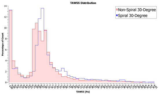 Quantitatively speaking, the spiral configuration resulted in higher TAWSS. Table 3 compares the maximum and area average values of TAWSS. The values were averaged across the entire length of the host artery. The non-spiral graft yielded a higher maximum TAWSS value, but its difference from the maximum value of the spiral configuration was practically negligible. On the contrary, the spiral configuration resulted in a higher TAWSS area average than that of its counterpart. In support of this, Figure 15 shows the percentage count of elements in the model according to the TAWSS value. As can be seen, a larger area of the artery was covered with elevated TAWSS when the spiral graft configuration was used. Conversely, at lower TAWSS, the non-spiral graft configuration had higher counts.