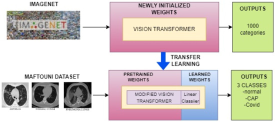 In the one-step approach, we utilized our pre-trained Vision Transformer model along with our customized linear classifier to fine-tune the model using our curated dataset, as depicted in Figure 3. The aim was to classify the input images into three classes, corresponding to our fine-tuning dataset. The fine-tuning process involved adjusting the model’s pre-existing parameters to better suit our target task while keeping its fundamental structure intact. This enabled the model to learn new features that were specifically tailored to our classification task. To assess the performance of the model, we employed five-fold cross-validation and computed the mean and standard deviation. The details of the results obtained using this approach are discussed in Section 3.