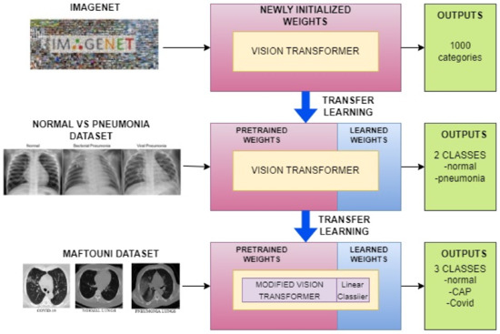 In the two-step transfer learning approach, we first fine-tuned the pre-trained Vision Transformer model on a chest X-ray image (pneumonia) dataset (PAUL MOONEY), which consists of X-ray images labeled as normal or pneumonia. This allowed us to incorporate additional relevant information into our pre-trained model, making it more suitable for our multi-class classification task. We then customized the pre-trained model with our own linear classifier and further fine-tuned the model using our curated dataset, which includes COVID-19, pneumonia, and normal chest X-ray images. The fine-tuning process using the curated dataset allowed us to improve the model’s performance on our specific classification task. By fine-tuning the pre-trained model with our dataset, we were able to leverage the knowledge already present in the pre-trained model and adapt it to our specific use case. This allowed us to achieve better results than if we had started training the model from scratch. The use of two-step transfer learning has been shown to be effective in various computer vision tasks, particularly in cases where the target dataset is small and may not have enough data to train a model from scratch. In our case, the COVID-19 dataset was limited, the two-step transfer learning approach allowed us to overcome this challenge and achieve better results. Figure 4 illustrates the process we followed in the two-step transfer learning approach, highlighting the steps involved in fine-tuning the pre-trained model on the pneumonia dataset and then further customizing and fine-tuning it using our curated dataset.