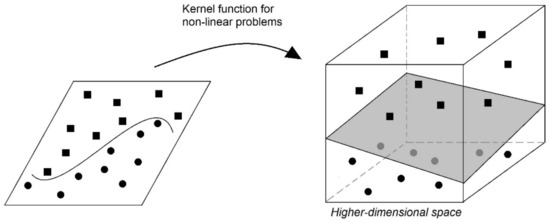 Next, in Figure 2. the main principle for a non-linear problem is presented. This includes higher dimensional spaces via kernel functions.