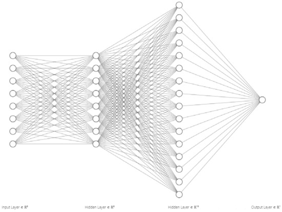 The dependent variable in this study was the intention to implement ICTs. As this is a binary classification, a binary cross-entropy was used as the loss function, and the Adam optimizer was used for compiling the model. Categorical variables were encoded using one-hot encoding, and feature values were standardized with StandardScaler. Figure 3. presents the architecture schematics of the neural network used in this study.