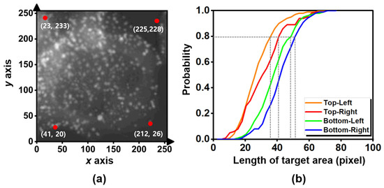 Statistical results of the two additives: (a) represents the averaged positions (red dots) of the alphabet characters and scale bars regarding the example of the microscopic images (reprinted with permission from Ref. [12]. Copyright (2020) Elsevier) and (b) represents the cumulative probability distribution function, according to the length of the target area (pixel) of the target regions comprising the additives.