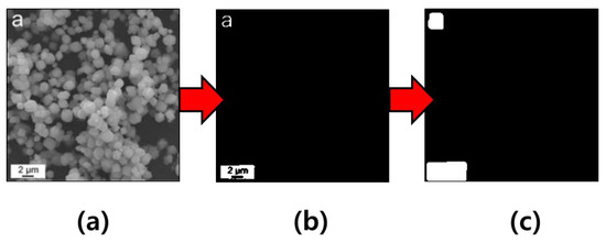 Next, we designed an algorithm that generates a threshold-based mask. When we investigated 1100 images, we checked that the microscopic images mostly took on extremely white-colored additives against a dark background. Therefore, we defined the threshold-based mask to include white pixels of a higher threshold as the additives, as well as black pixels of a lower threshold for the others. For distinguishing the pixels of the additives, as well as the others, we used a threshold value of 200 in gray scale. In Figure 4a, this can be black on the additive, but white around the additive. When we used only a threshold value in order to distinguish the pixels of these, the additive filled the black pixels remains as a non-removable object, as can be seen in Figure 4b. Therefore, we added the function that the pixels close to the white pixels possess a white color in the algorithm. We observed that the regions of the additives can possess white, and the regions of the others can possess black with respect to the result of the algorithm (see Figure 4c). The threshold-based mask code that we implemented is available at https://github.com/hmnd1257/threshold-mask (accessed on 16 February 2023).