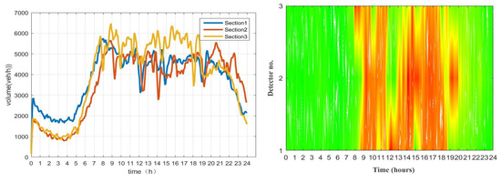 Traffic detectors are set on the main line in Meicun service area, airport interchange, and Shuofang junction as Section 1, Section 2 and Section 3. The cross-sectional flow and average speed of the road sections in the study area are illustrated in Figure 3. In general, the maximum hourly traffic volume did not exceed 7000 veh/n on the weekdays surveyed. Between 0:00 and 6:00, the hourly traffic volumes did not exceed 3000 veh/n. These values increased between 6:00 and 9:00, gradually approaching 6000 veh/n. Between 9:00 and 20:00, traffic volumes fluctuated between 4000 and 6000 veh/n. The section speed distribution is similar, with smooth traffic and high speeds between 0:00 and 6:00; a gradual decrease in speed between 6:00 and 9:00; and low speeds, high volumes, and relatively congested roads between 9:00 and 20:00.
