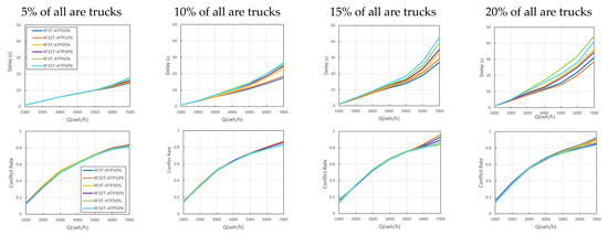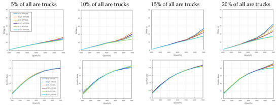 It is apparent that the 4F3T strategy incurs smaller delays than the 4F32T strategy under the same conditions, with truck traffic volumes of 5%, 10%, and 15%. Conversely, the 4F32T strategy exhibits a lower delay for a truck traffic volume of 20%. The conflict rate difference between the two strategies is consistent with the conclusion of the delay difference. This indicates that for a truck traffic volume of ≤15%, the interference between trucks and passenger cars must be reduced, and HDT should be restricted to the third lane. Conversely, when the proportion of trucks reaches 20%, the second lane needs to be opened to HDT to improve overall traffic capacity.