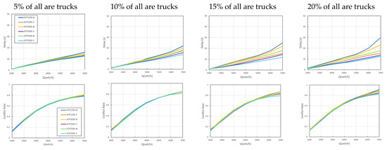 Figure 4 illustrates a comparison of the delay and conflict rates with respect to HDT on the second lane when truck platooning in the queue phase passes through the weaving section on an exclusive lane. Each column in Figure 4 represents the proportion of trucks in the total traffic flow. Here, ATP indicates automated truck platooning, with the corresponding percentage denoting the amount of automated trucks compared to the overall truck traffic.