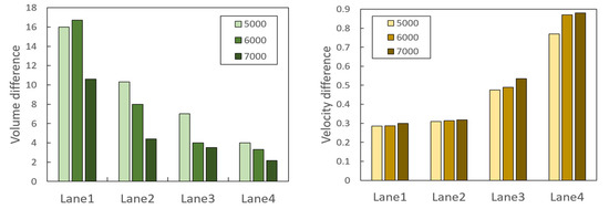 Figure 8 shows a comparison, in terms of volume difference and velocity difference, of different lanes with and without optimal speed control under the same strategy as in Figure 7. In the context of this figure, the lanes are sequentially labeled from the inside to the outside.