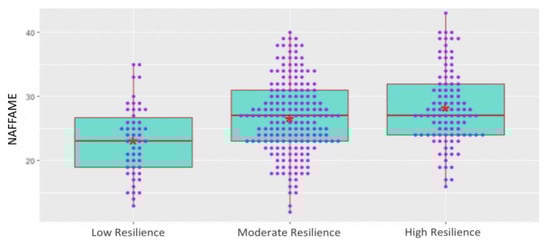 To further explore the association of NAFFAME with the main variables of our study, we categorised PsyR, sleep quality, and BMI. PsyR was grouped into low resilience (CD-RISC-10 score < 20), moderate resilience (CD-RISC-10 score = 20–29), and high resilience (CD-RISC-10 score = 30–40); sleep quality was grouped into low (SQS = 0–3), adequate (SQS = 4–6), and high (SQS = 7–10); and BMI was categorised as underweight (BMI < 18.5), normal (BMI = 18.5–24.9), overweight (BMI = 25–29.9), and obesity (BMI = 30+), according to guidelines. One-way ANOVA and an independent-samples Kruskal–Wallis test were performed in order to observe the difference in the means of NAFFAME in different CD-RISC-10, SQS, and BMI categories. There was a statistically significant (p < 0.05) difference between the means of the NAFFAME score in different CD-RISC-10 categories (Figure 1).