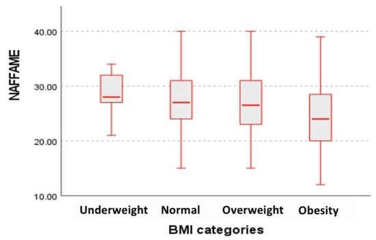 BMI in our study was not normally distributed; therefore, we performed an independent-samples Kruskal–Wallis test. There was a significant (p = 0.008) difference between the means of the NAFFAME in different BMI categories (Figure 2).