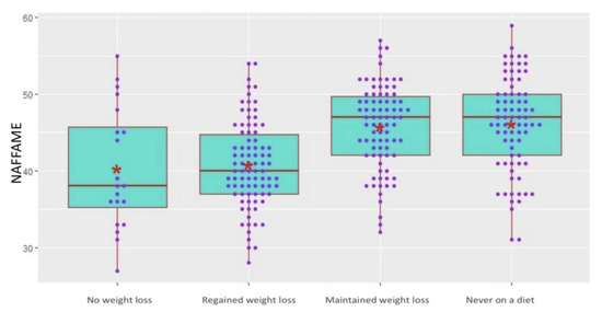 NAFFAME consumption seemed to be important for the long-term results of a weight-reducing diet. After conducting a one-way ANVOA test, it was found that there was a statistically significant difference (p < 0.012) in the mean scores of NAFFAME for different diet outcomes. The means of NAFFAME were higher in the no need for diet and maintaining weight loss categories than the no weight loss and regaining weight categories (Figure 3).
