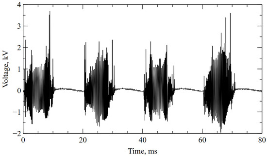 Two diverging copper electrodes (⌀ = 2 mm, L = 80 mm) of a GAD reactor operated at atmospheric pressure. The electrodes were placed in a glass tube of ⌀ = 50 mm. Air was selected as the substrate gas, and the flow rate of 440 L/h was maintained with a glass tube variable area flow meter (Zakłady Automatyki “ROTAMETR”, Gliwice, Poland). The power supply was based on an electronic high-voltage transformer of 50 Hz operation cycle. It consists of converter giving a series of high-voltage microimpulses in a 10 ms time span so the transformer works in a cut-off state for the next 10 ms. The frequency of the pulses (from 5 to 20 kHz) and their amplitude are variable, which is mainly due to the high irregularity of the electricity caused by the influence of gas dynamic forces (Figure 1). The apparent power of the reactor was 40 VA at an RMS (root-mean-square) voltage of 680 V (3.7 kV peak voltage). Previous studies, which were performed using time-integrated optical emission spectroscopy, have shown that the reactor is a source of non-equilibrium plasma in which the dominant gas products are nitrogen oxides [46].
