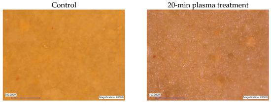 Microscopic observations made using an optical microscope and the applied magnifications indicate that plasma treatment does not significantly affect the morphology of diatomaceous earth, which is mainly SiO2 amorphous silica with minor admixtures of crystalline silica, calcium, sodium, iron, magnesium, copper, zirconium, titanium, boron, manganese, and other compounds. As expected, drying of the samples was observed with longer processing times, making the grains more visible. Despite the relatively low processing temperature, drying resulted from the working gas flow. Figure 3 shows a comparison of imaging diatomaceous earth with variable grain size in the control sample and the sample treated with plasma for 20 min.