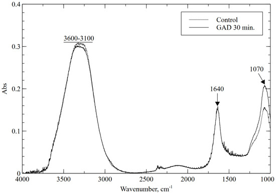 For all tested treatment times, the obtained FTIR spectrum does not differ significantly from the spectrum for the control sample, as shown in the example in Figure 4 for a treatment time of 30 min. The spectrum shows peaks characteristic of diatomaceous earth. The broad band between 3100 and 3600 cm−1 is due to H-O-H stretching vibrations of absorbed water, whereas the band at 1640 cm−1 may be related to the presence of water H-O-H bending vibrations from the absorbed water in opal present in the sample [51]. The very strong absorption peak at 1070 could be related to Si-O stretching vibrations from Si-O-Si [53]. For all treatment times, slightly reduced absorbances were observed for the H-O-H band with a slight increase in the Si-O band, which may be related to the evaporation of water during treatment. The obtained spectra were consistent with those reported in the literature; no formation of new functional groups was observed for any of the conditions.