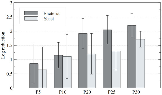 Based on the test results shown in Figure 5, it should be concluded that the non-equilibrium plasma has a strong lethal property against the tested bacteria and yeast. In the control sample, not subjected to plasma treatment, the following levels of bacteria and yeasts were found: 635,760 (CFU∙g−1 D.M.) and 1,046,722 (CFU∙g−1 D.M.), respectively. It was clearly visible in the plasma-treated samples that the number of microorganisms decreased with the increasing contact time of diatomaceous earth with plasma. The best results were obtained after 30 min of plasma treatment, as bacterial and yeast counts dropped to 2461 and 42,033 (CFU∙g−1 D.M.), respectively. However, even at shorter contact times the plasma worked effectively. A large decrease in the number of bacteria was observed after 10 min of plasma treatment of diatomaceous earth and amounted to 120,707 (CFU∙g−1 D.M.). In the case of yeast, successive count decreases were more evenly distributed and proportional to the plasma treatment time. Analysis of the obtained results showed that the log10 reduction of bacteria relative to the control was as follows: 0.86 (P5), 1.15 (P10), 1.92 (P20), 2.05 (P25) and 2.20 (P30). In contrast, the log10 reduction of yeasts was: 0.64 (P5), 1.11 (P10), 1.2 (P20), 1.3 (P25) and 1.72 (P30). The lethal properties of non-equilibrium plasma against bacteria and yeasts were also confirmed by other authors [56,57,58]. Prehn et al. [56] found a 31–89% decrease in E. coli (depending on the strain) in plasma-treated air. Maeda et al. [57] observed 100% elimination of multidrug-resistant strains of Salmonella enterica after just 5 min of plasma treatment. On the other hand, Ryu et al. [58] examined the effect of environmental factors on the survival of S. cerevisiae yeast cells placed in two solutions: water and saline. Their study revealed that yeast cells treated with plasma in water underwent the most severe morphological and physiological damage, including damage to membrane lipids and genomic DNA. S. cerevisiae cells treated with plasma in saline were much less damaged. The shares of yeast cells that survived plasma treatment were 80% and 40% for saline and water, respectively. Ryu et al. [58] concluded that this was due to the protective role of saline against yeast, weakening the effect of free radicals. Soušková et al. [59], during their study on plasma treatment of Candida albicans yeast in an aqueous suspension, obtained even better results because the number of cells that survived the process dropped dramatically from 5 × 104 CFU/mL to zero after just 6 min of contact with plasma. As the examples above show, it is clear that non-equilibrium plasma can be used to eliminate microorganisms from various sources.