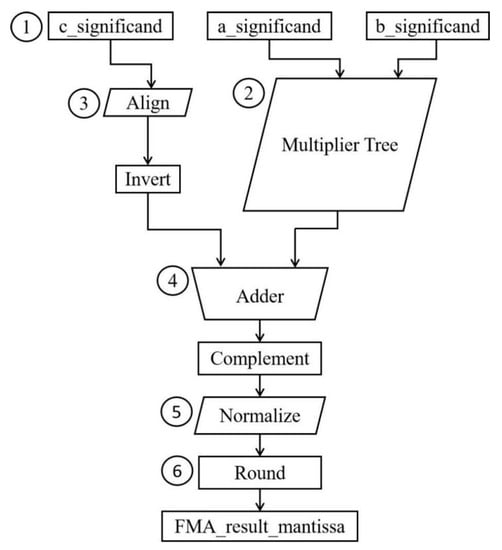 The algorithm process of the FMA operator is shown in Figure 3. There are six serial steps to complete the execution of a FMA operation on traditional architecture [27,28,29]: