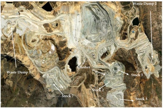The study area covered an open-pit mine in Peru (Figure 2) that produces copper concentrates and is developing the expansion of its operations from 100,000 to 14,000 tons per day. The equipment present at the mine is made up of 29 CAT 797F haul trucks, 3 CAT 7495 rope shovels, and 2 LT-2350 FEL. Moreover, all the moved material goes to five destinations, including two waste dumps, a crusher, and three stockpiles.