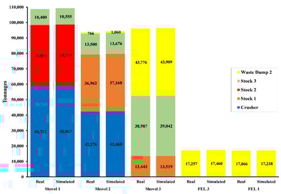In Figure 3, it can be observed that real tonnages moved during the chosen day were almost similar to the results obtained from the simulation. This difference could be reduced even more if the bucket payload was added, as this restriction would limit the total tonnage to load, and the result would be closer to the real tonnage.