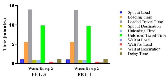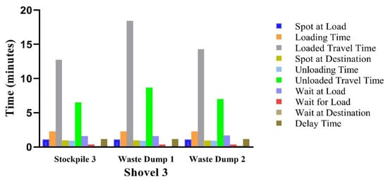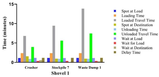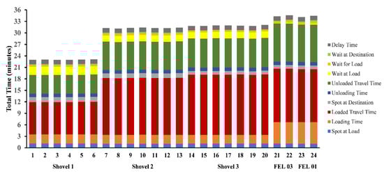 Regarding the number of trucks employed by the simulation for each piece of loading equipment, the simulation required 24 trucks in total during that day, as shown in Table 7.