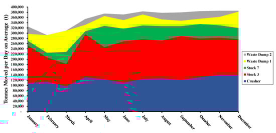 The month-to-month planned tonnages varied, as shown in Figure 9. Furthermore, the overall daily tons moved month-to-month was increased from 325,000 tons in January to 386,000 tons in December, maintaining this value consistently since July.
