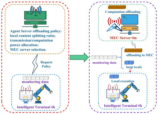 A new framework for the intelligent fault diagnosis system is proposed in this paper, which consists of MEC servers and intelligent terminals, as shown in Figure 4. Both MEC servers and intelligent terminals can process monitoring data, and the intelligent terminal can offload data to any MEC server through the agent. The interaction between the intelligent terminal and the MEC server operates in the orthogonal frequency division multiple access frameworks. The offloading policy includes the local content splitting ratio, the transmission/computation power allocation, and the MEC server selection. According to the offloading policy, the monitoring data is split into two parts: one is offloaded to the MEC server for processing and the remaining part is kept locally for processing by the intelligent terminal. The intelligent fault diagnosis system based on the MEC framework can be divided into three models: the network model, the communication model, and the computing model. These will be introduced separately in the following.