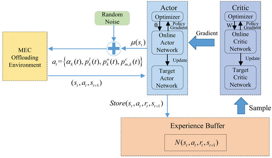 Compared to the DQN-based offloading paradigm, the DDPG-based offloading paradigm does not need the MEC servers to solve the optimization problems, which can release the computation burden at the MEC servers. However, as the DDPG algorithm is generally more complex than the DQN algorithm, the computation complexity unavoidably increases at the agent. The structure of the DDPG-based offloading algorithm is illustrated in Figure 6. We provide the pseudocode in Algorithm 2.