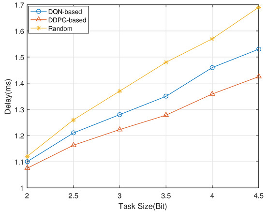 In Figure 8, the DDPG-based computational offloading paradigm, the DQN-based computational offloading paradigm, and the “Random” policy are compared for different task sizes in terms of delay. “Random” means that the computing resources are allocated randomly. The delay difference between the three policies is slight at task sizes below 2.5 bit, with the DDPG-based computational offloading paradigm having the smallest delay and the “Random” policy having the largest delay. The delay of the “Random” policy increases the most as the task size increases, while the latency of the DDPG-based computational offloading paradigm and the DQN-based computational offloading paradigm increases slightly less. The delay of DDPG’s computational offload paradigm and DQN-based computational offload paradigm consistently remains low compared to the “Random” policy.
