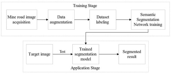 The detection process of the drivable area of the underground mine road image is shown in Figure 1. It mainly includes two stages of training and application. In the training stage, the mine road image is collected by the camera mounted in front of the mine car, and the dataset is expanded by the data enhancement method, and the driving area of the underground mine road is marked. The underground mine road image dataset is put into the semantic segmentation network for training. When the loss value converges, the model is trained. In the application stage, the driving area of the underground mine road can be detected by inputting the image of the underground mine road into the trained model.