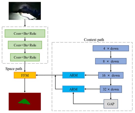 BiSeNet is used as the basic network model for semantic segmentation of underground mine slopes. The BiSeNet network designs two branch networks, namely Spatial Path and Context Path (CP). Aiming at the problem of spatial information loss in semantic segmentation, the spatial path solves the problem of spatial information loss by acquiring more low-level features, thus encoding rich spatial information, while the context path provides a larger receptive field.
