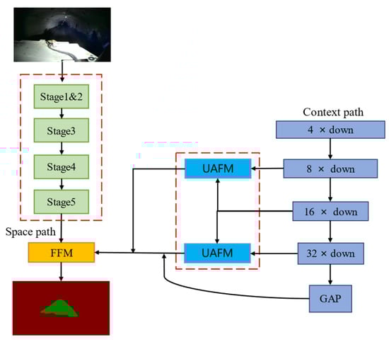 The underground mine road environment is complex, and has problems such as uneven roads, obstacles, and insufficient illumination. The mainstream deep learning model, although high in accuracy, cannot run complex deep learning network models due to the limited computing power of the mine car’s on-board computer. Therefore, in the face of the complex mine road environment, it is difficult to meet the real-time demand. BiSeNet’s semantic segmentation algorithm uses a lightweight backbone specially designed for classification tasks, and cannot give full play to the performance of the BiSeNet algorithm in the field of semantic segmentation. Due to the complex environment of underground mines and poor light conditions, BiSeNet using the classification backbone network cannot accurately identify roads. For the situation of underground mine roads, the network needs to be improved. STDC is a real-time semantic segmentation network proposed by Meituan, which gradually reduces the dimension of feature maps and uses aggregated information to represent images [30]. On BiSeNet, this study replaced the backbone network with STDC. By changing the backbone network, the real-time performance of the network model is improved, and can also achieve better real-time performance within the complex and changeable environment of the underground mine road. The improved BiSeNet mainly consists of a spatial path and a contextual path. First of all, the lightweight network short-term dense concatenate is used as the backbone network of the encoder in the space path, and the original three sets of convolutional layers are replaced. The replaced backbone is composed of STDC modules. The number of deep feature channels is small, and the number of shallow feature channels is large. The STDC module uses skip connections to enrich features, so that the lower layers have enough channels to encode more detailed information with smaller receptive fields, and the higher layers with larger receptive fields strengthen the expression of high-level information. The backbone network composed of STDC modules can reduce the calculation amount of the model network and improve the calculation speed. A unified attention fusion module (UAFM) is added to the context path, which enriches the feature representation. The UAFM improves the detection level of underground mine slopes through channel and spatial attention. The semantic segmentation network model of the improved BiSeNet is shown in Figure 3; the red box of the space path is the lightweight backbone network STDC, and the red box of the context path is the UAFM.
